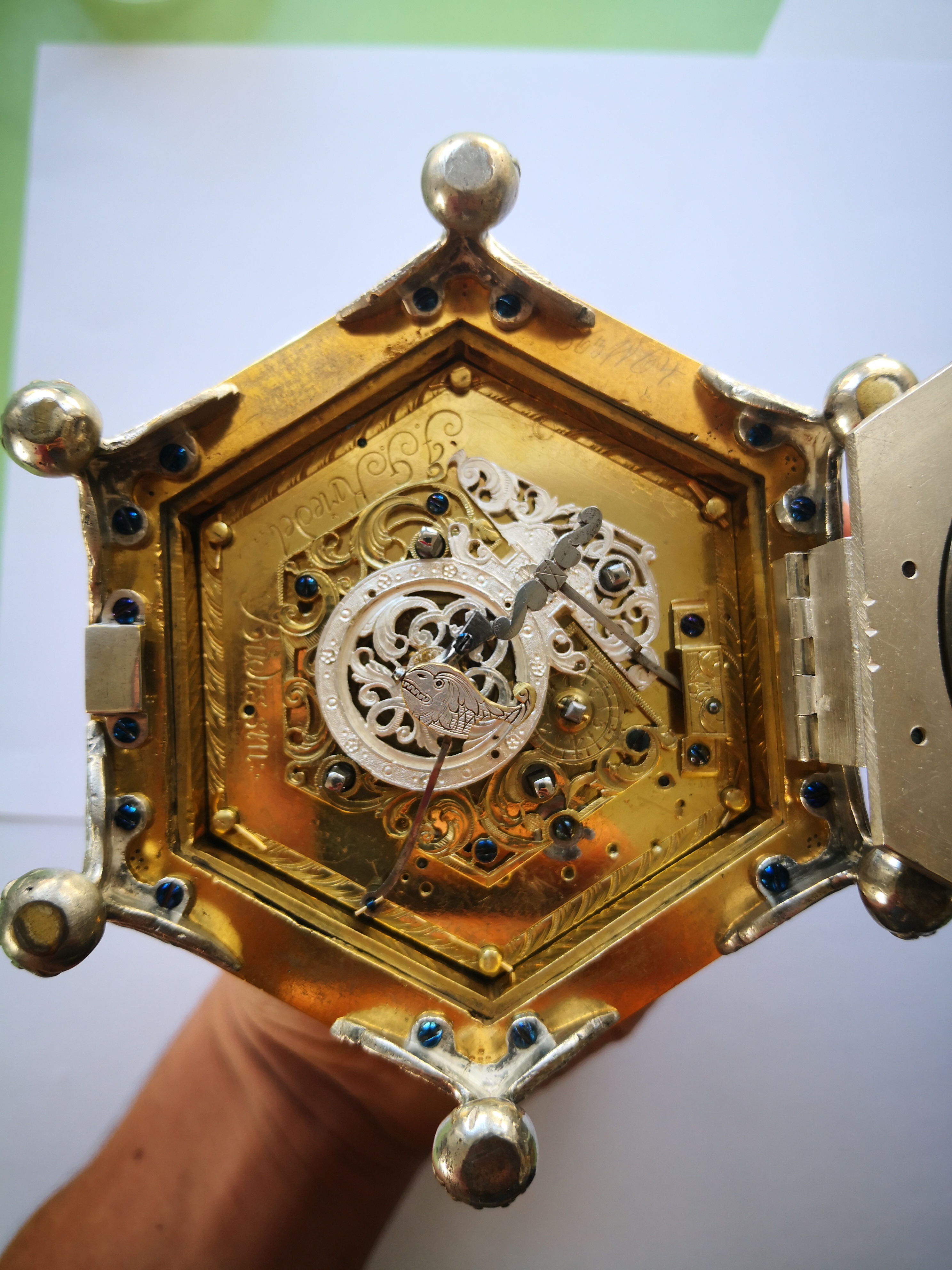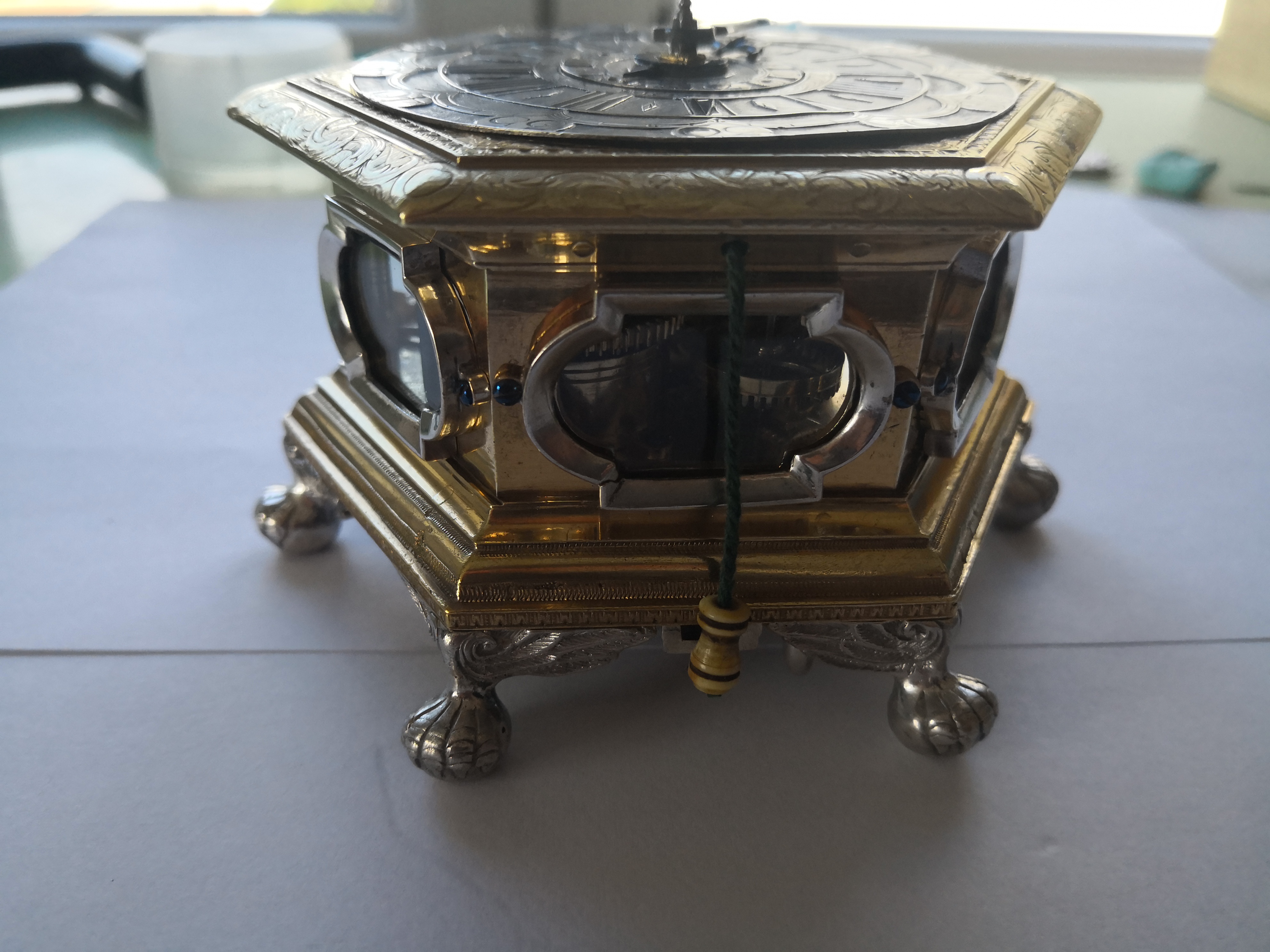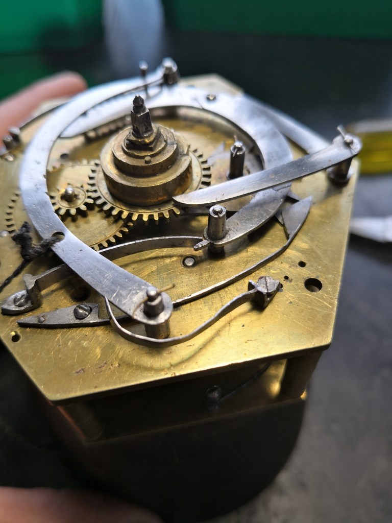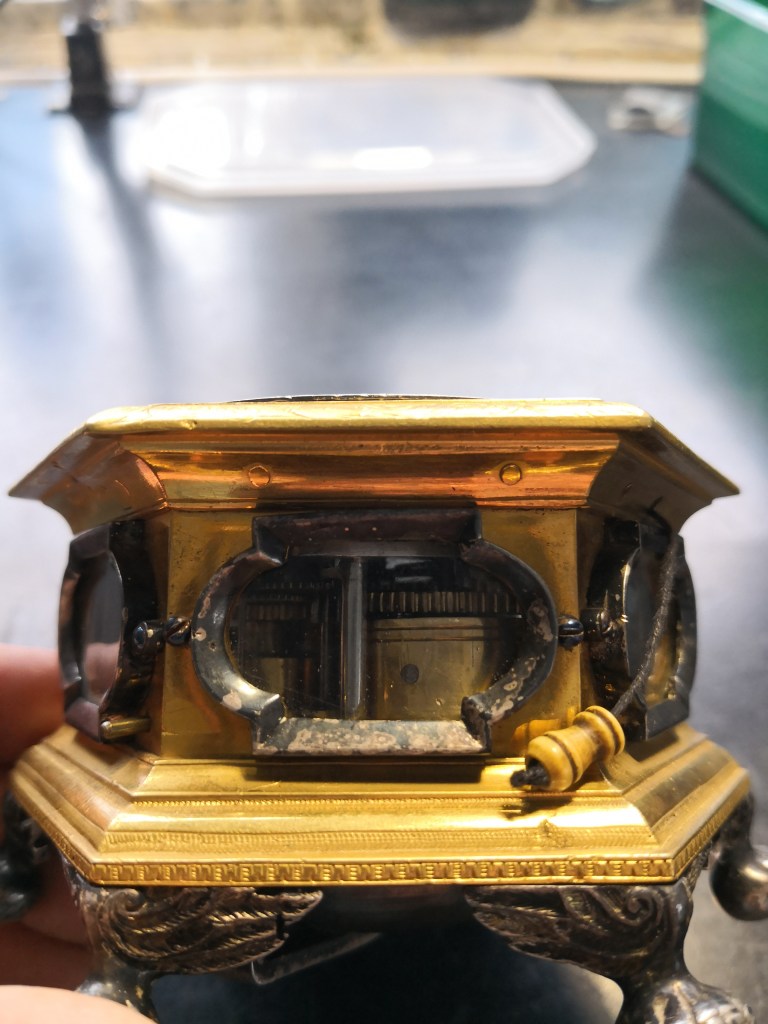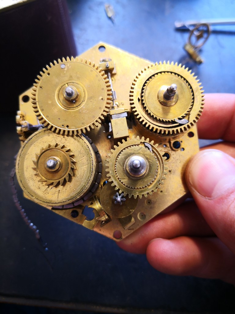 À la réception, dans son jus. La boîte en cuir est d’origine. La finesse des ciselures est magnifique ! Mécanisme animé par chaîne et fusée. Sonnerie par tirage pour avoir l’heure la nuit. Présence d’un réveil matin. Minuterie et sonnerie. Les pieds dans leurs jus. Les pieds nettoyé après et avant le lustrage. Toutes les pièces encore exécutées à la main.